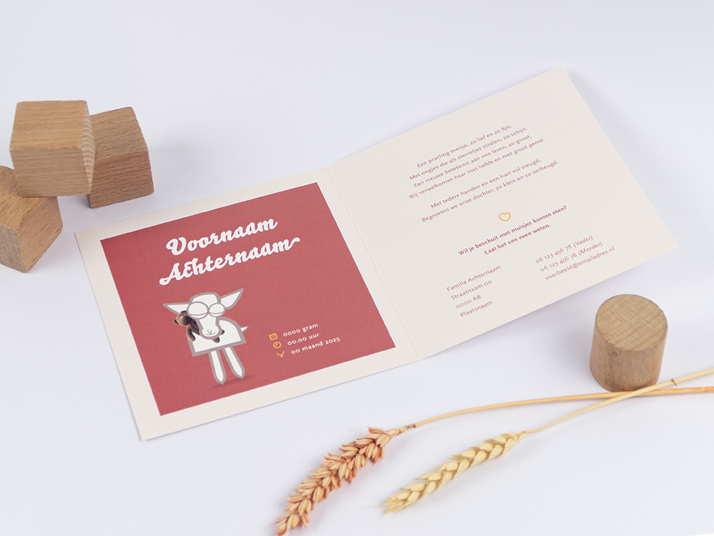 Deze geboortekaart is een gepersonaliseerd product en wordt speciaal voor jou geproduceerd. Dit product kan helaas niet geretourneerd worden. Kijk daarom de ingevoerde keuzes goed na voor je bestelt. Kleuren kunnen afwijken van de afbeelding.