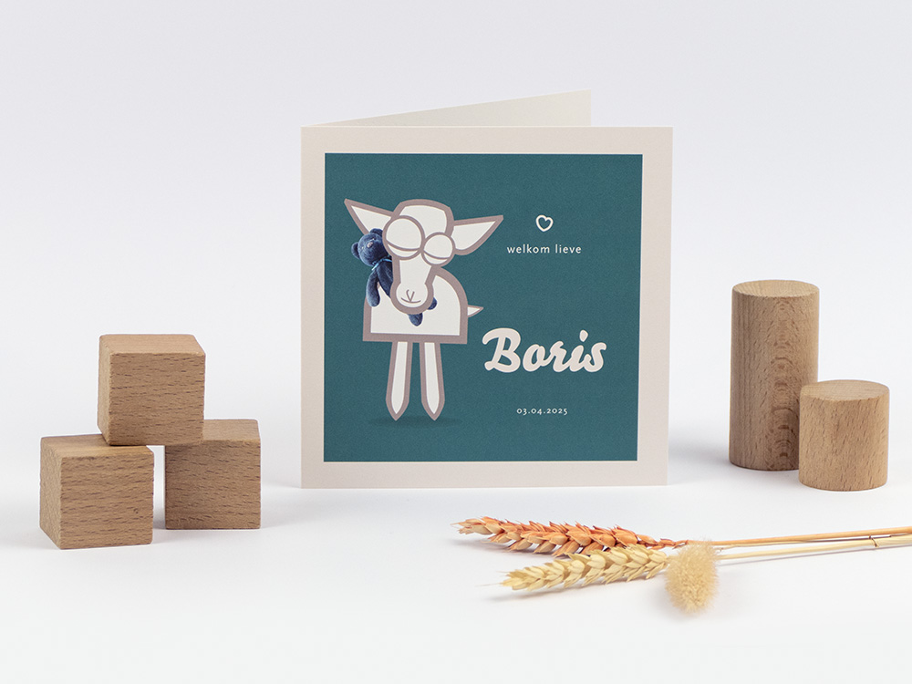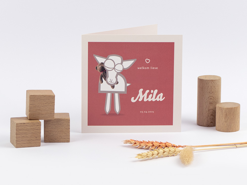 Welkom lieve …! Hoe heet jullie kleintje? Vier de komst van jullie kleintje met een geboortekaart van Broezel Lam, knuffelend met een beer. Dit tedere kaartje is beschikbaar in twee prachtige kleurenschema’s: oud Hollands roze en petrol oceaan groen.