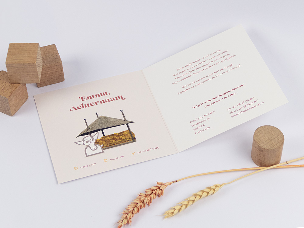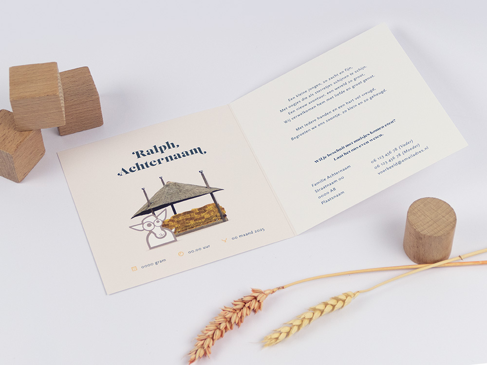 Deze geboortekaart is een gepersonaliseerd product en wordt speciaal voor jou geproduceerd. Dit product kan helaas niet geretourneerd worden. Kijk daarom de ingevoerde keuzes goed na voor je bestelt. Kleuren kunnen afwijken van de afbeelding.