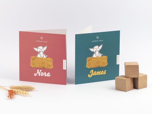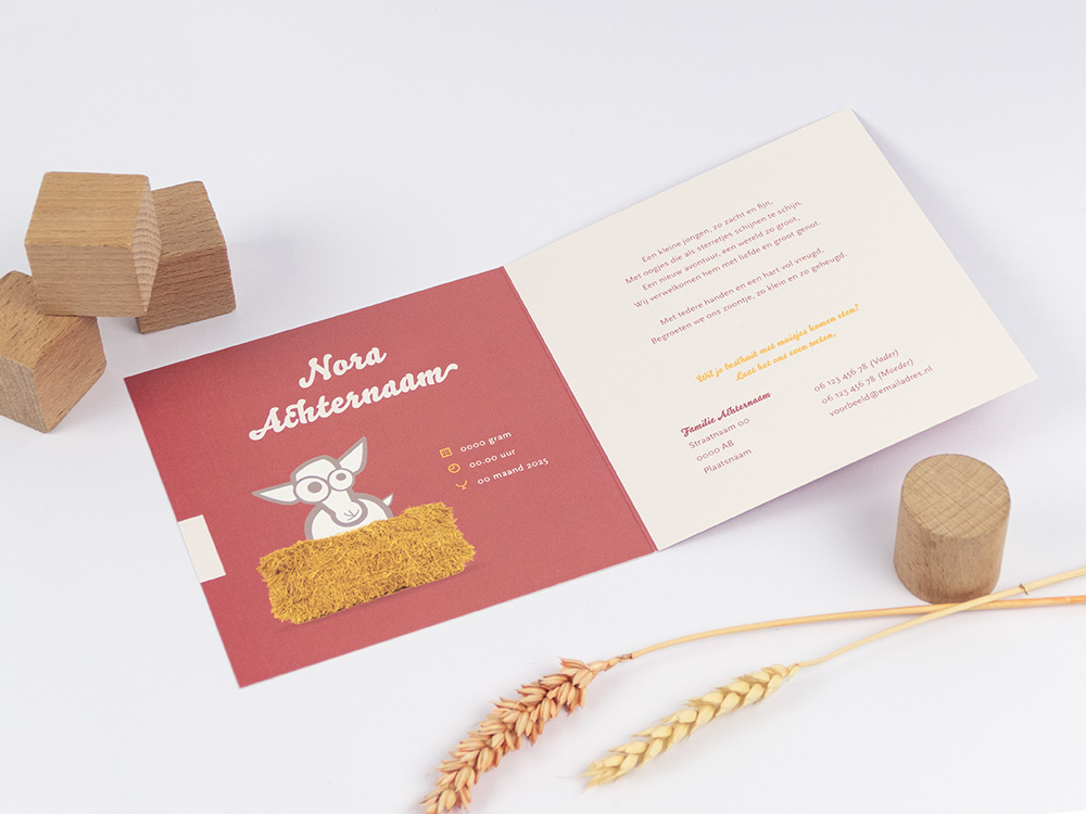 Vier de komst van jullie kleintje met een geboortekaart van Broezel Lam, liggend op een hooibaal. Dit liefelijke kaartje is beschikbaar in twee prachtige kleurenschema’s: oud Hollands roze en petrol oceaan groen.